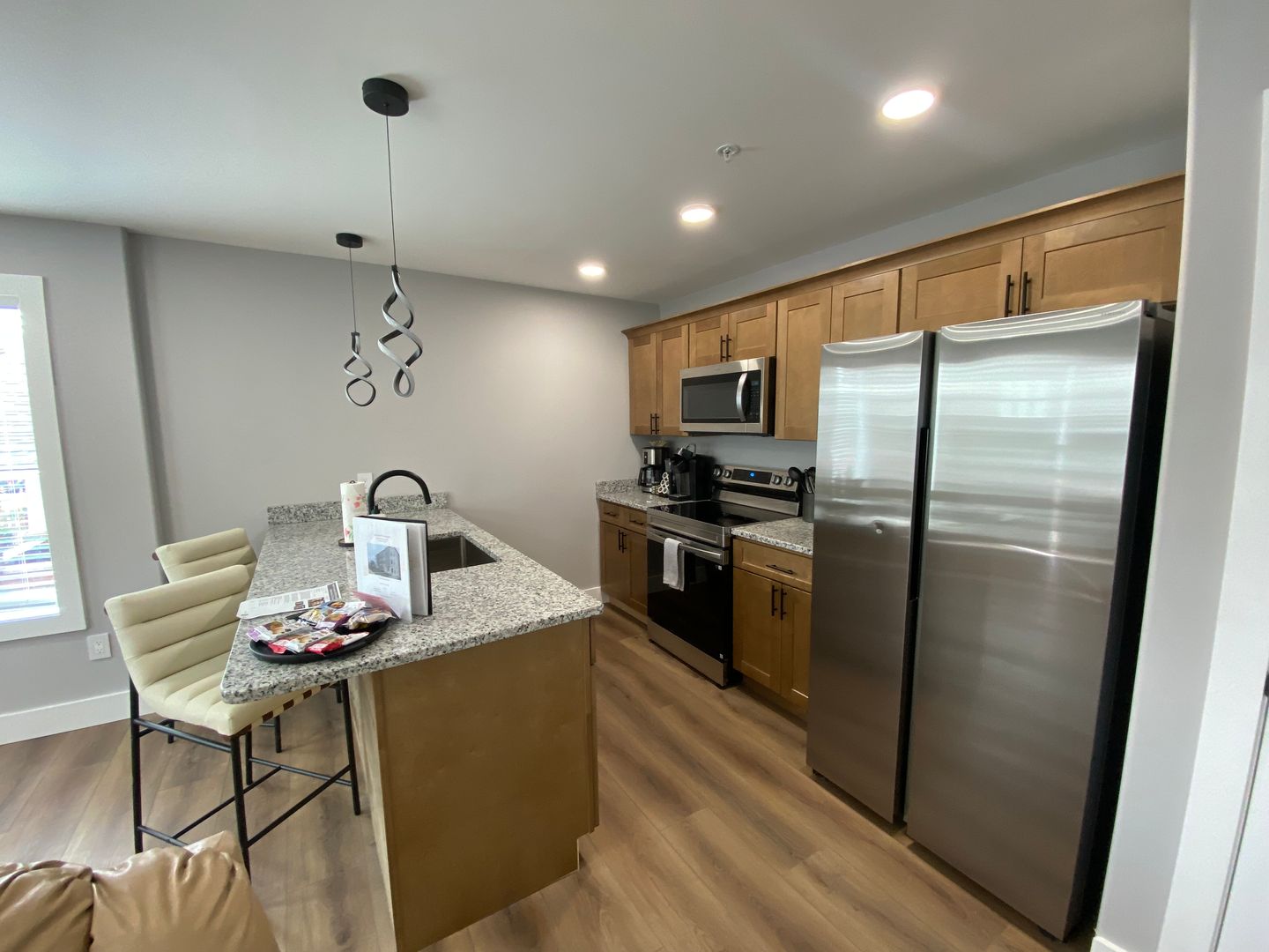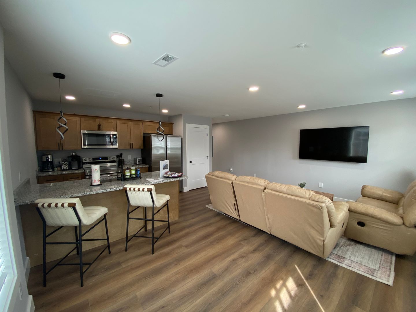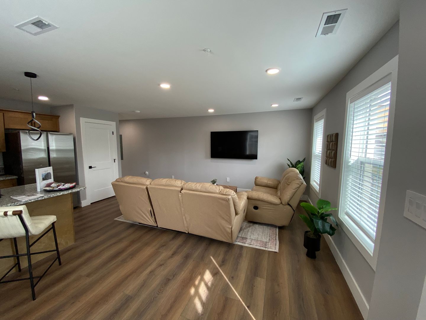 Each bedroom includes its own ensuite bathroom, providing a private retreat for every resident. The open-concept kitchen and living area features hardwood flooring, granite countertops, and custom tile showers, along with energy-efficient stainless steel appliances and sleek cabinetry designed for both function and style.